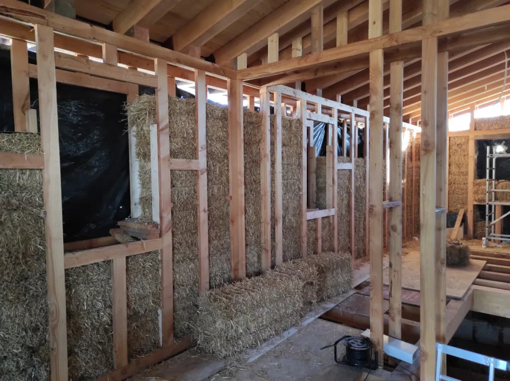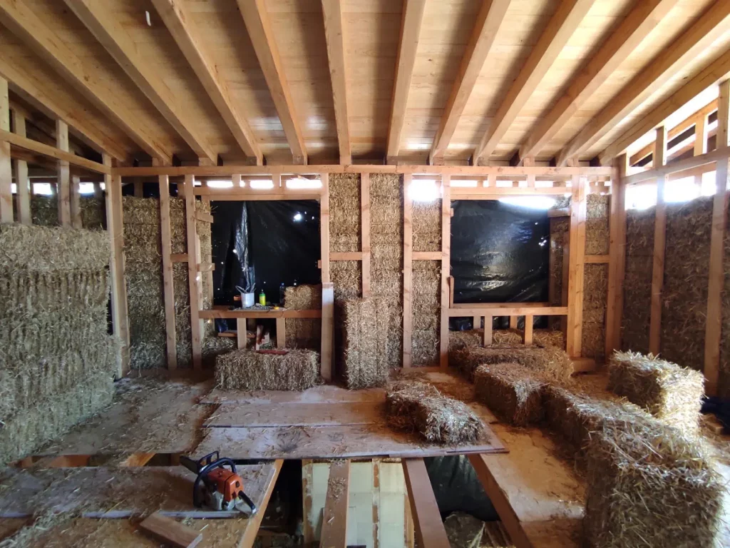 Detached straw bale house in self-construction with Greb technique, lime and clay plasters.