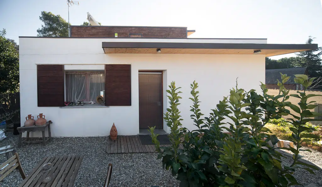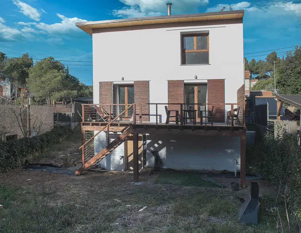 Straw bale house with GREB technique in Vacarisses; lime plaster, cross-laminated wood panel cover