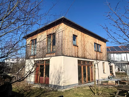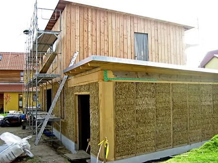 Wandaufbau: Wände EG: Kleinballen hochkant, Lehmputz innen, Kalkputz außen. Wände OG: Holzrahmenbau, Zelluloseflocken, Lärcheschalung.