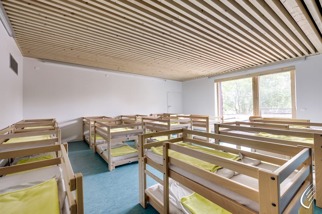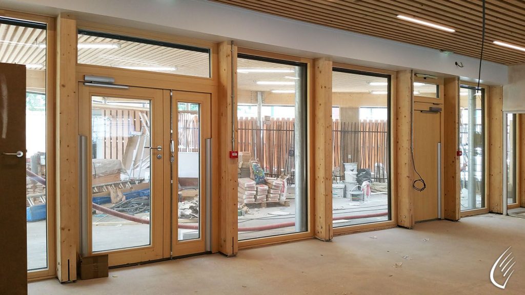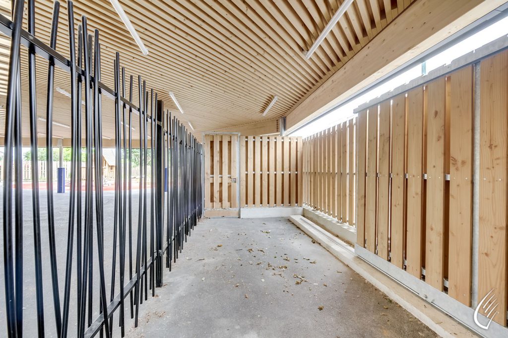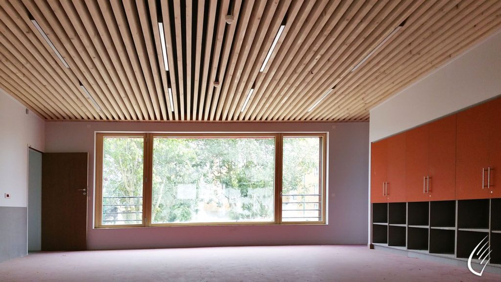 Construction of a two-storey nursery school with five classrooms and a school canteen. Macro closed covered lot; design, supply and installation of MOB straw insulation, rain screen and wood wool partitions, D-Dalle flooring, O’Portune slab roofing and courtyard, M2 cladding.