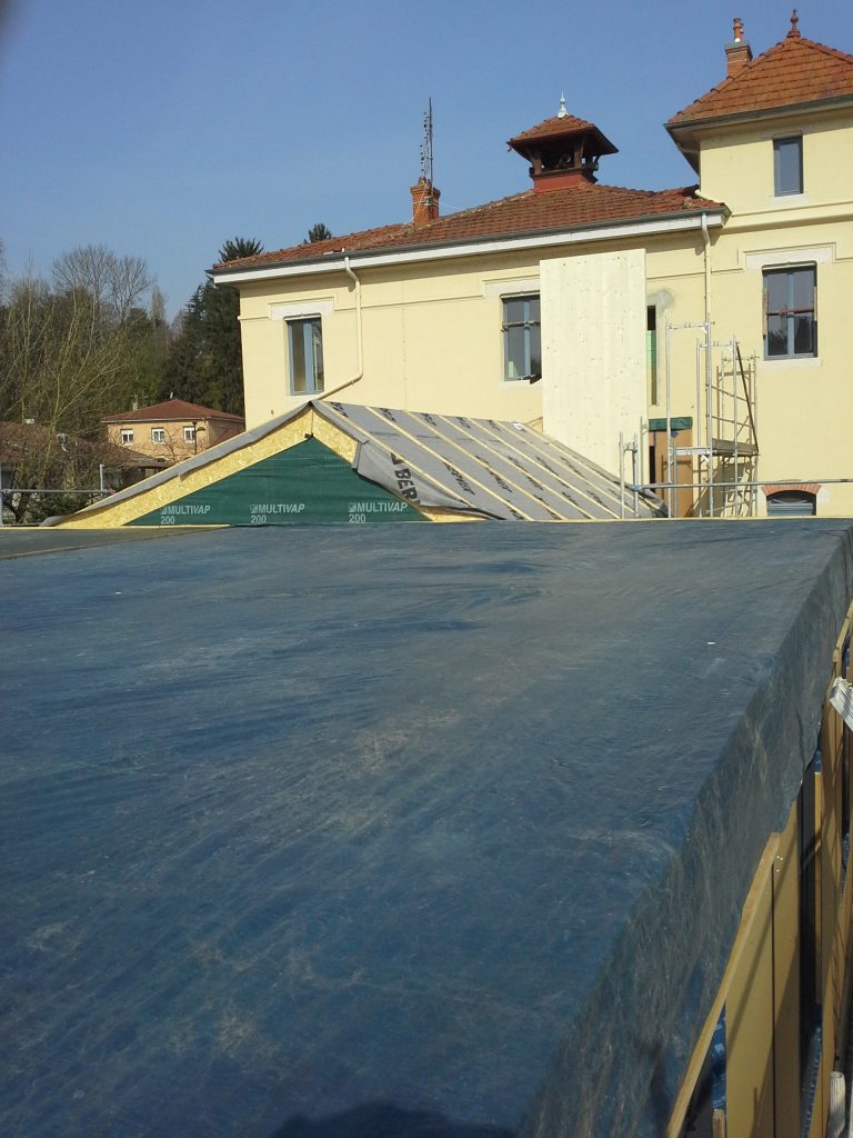 Renovation and extension of the town hall by a semi-detached building in wood frame. Prefabricated load-bearing boxes in the workshop, insulated with straw bales. Traditional gable roof covered with tile and terrace roof insulated with cellulose wadding. Stairwell and lift shaft made of glued solid wood panels.