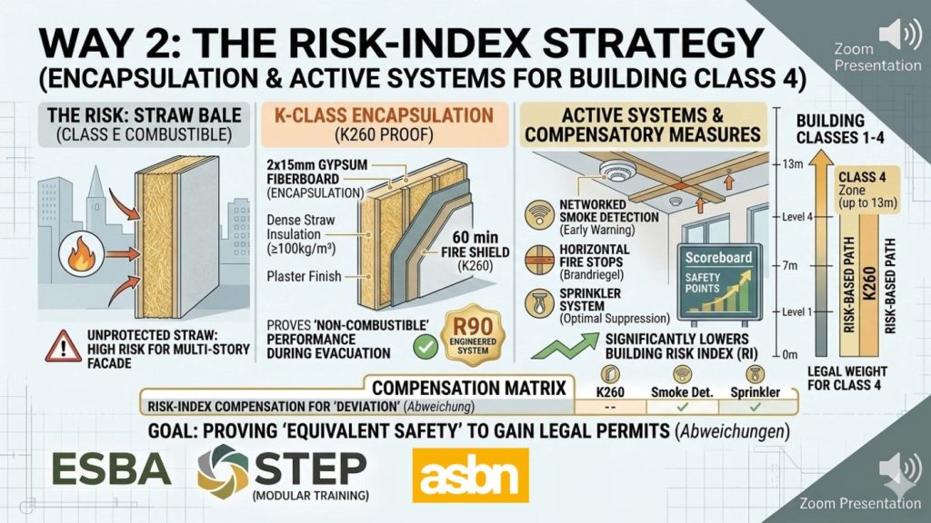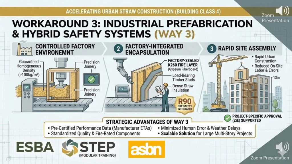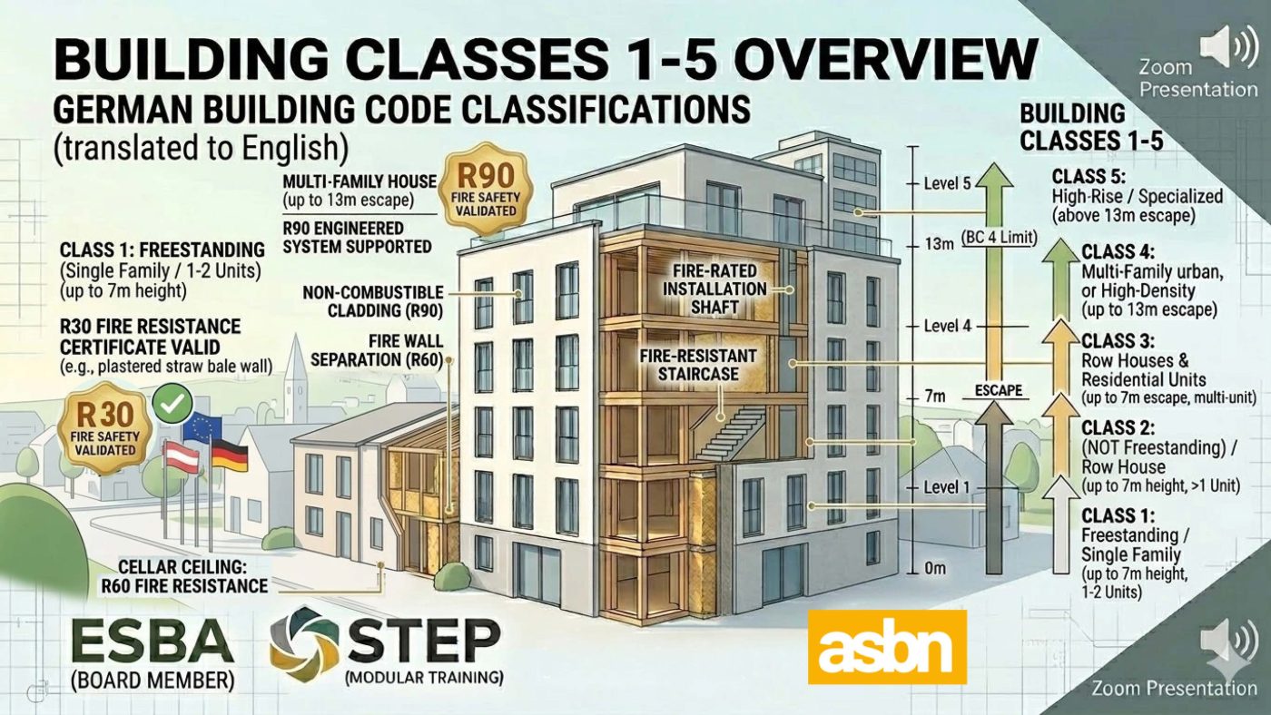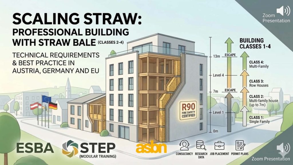 - 35:35: presented a summary of available certificates, proofs and workarounds for building straw bale houses in Building Class 1-4 (up to 13m height, multi-family and row house), by Herbert Gruber, ASBN