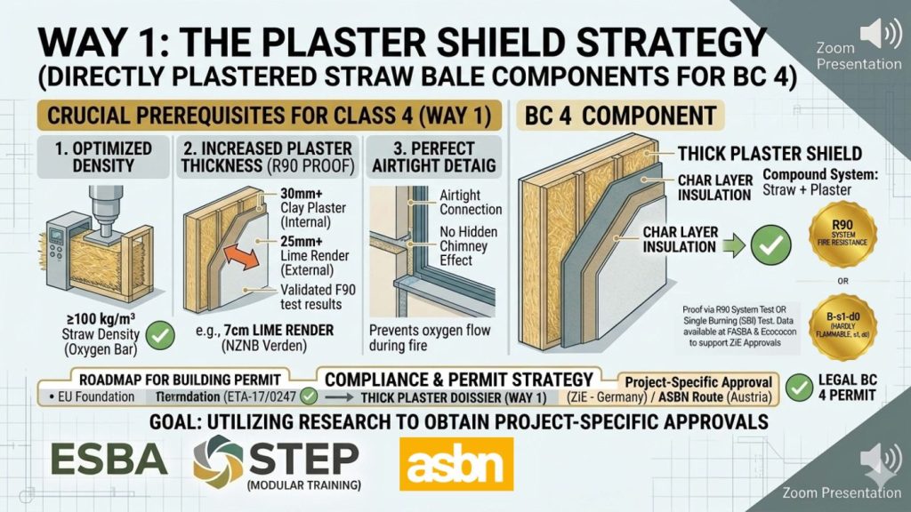 - (Way 1) Gesamtdokumentation des ZIM-Projekts “Direktverputzte Strohballenbauteile für die Gebäudeklasse 4” – Teilprojekt “Brandschutztechnische Untersuchungen” (DE) – Complete documentation of the ZIM project “Directly plastered straw bale components for building class 4” Subproject “Fire protection investigations” (EN translation)