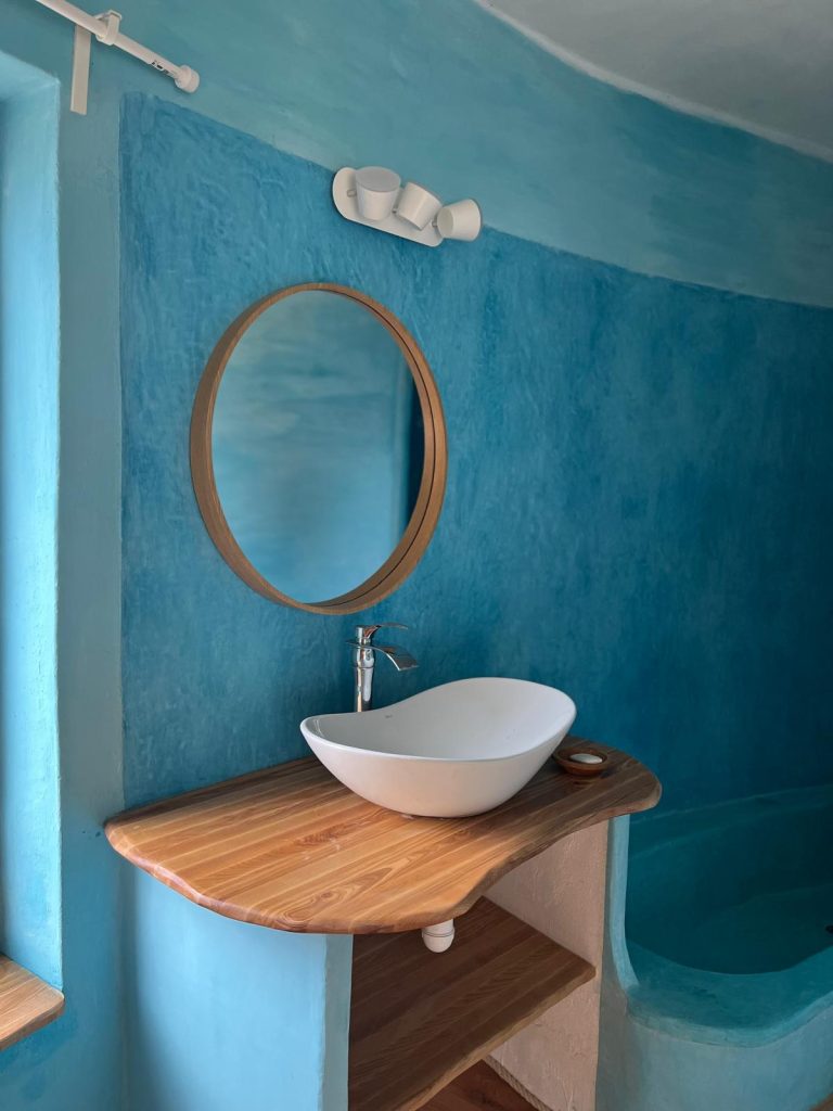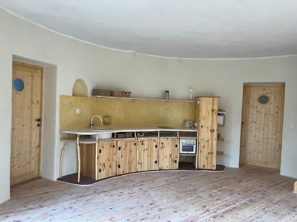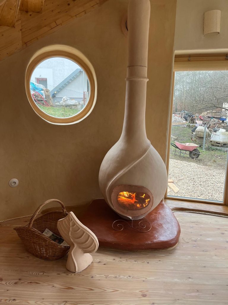 Built in StrawHenge modular prefab technique by asbn/StrohNatur, this building consists of 2 storeys, first floor as round house (two circles), secon floor with a 8m diameter dome on top, which was built on site on the ground and lifted with crane on the straw bale ceiling of the first floor. Straw bale Infill and base plasters were done in asbn workshops, finishings werde done by Nadia, the owner.